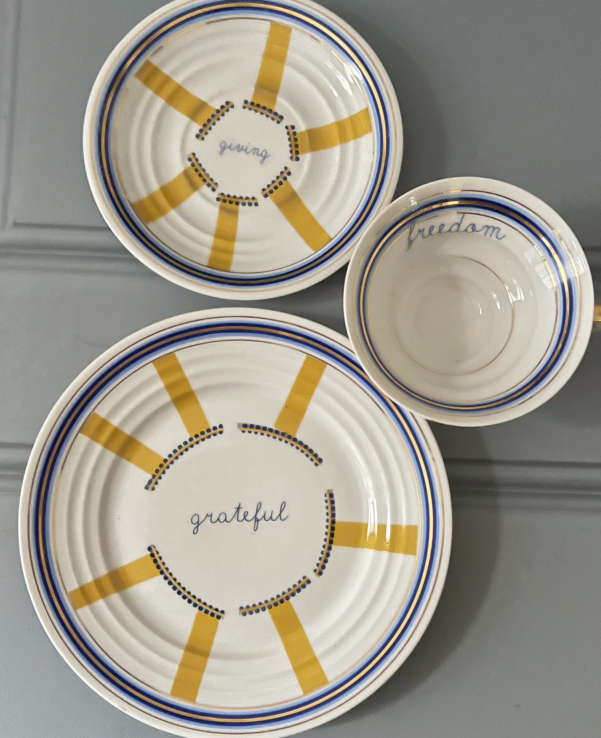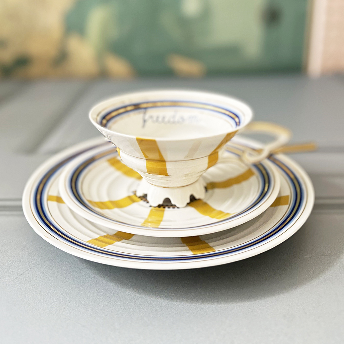donosi novu emociju starim komadima. Svaka šoljica, tanjirić i tanjir pažljivo su odabrani, restaurirani i oslikani ručno u našoj radionici, stvarajući unikatni spoj nostalgije i modernog dizajna. Motiv zutih linija i natpis „freedom“ podsjećaju da svakodnevni trenuci zaslužuju pažnju i ljepotu. Ovaj set je savršen za jutarnju kafu, popodnevni čaj ili kao poseban poklon dragoj osobi.