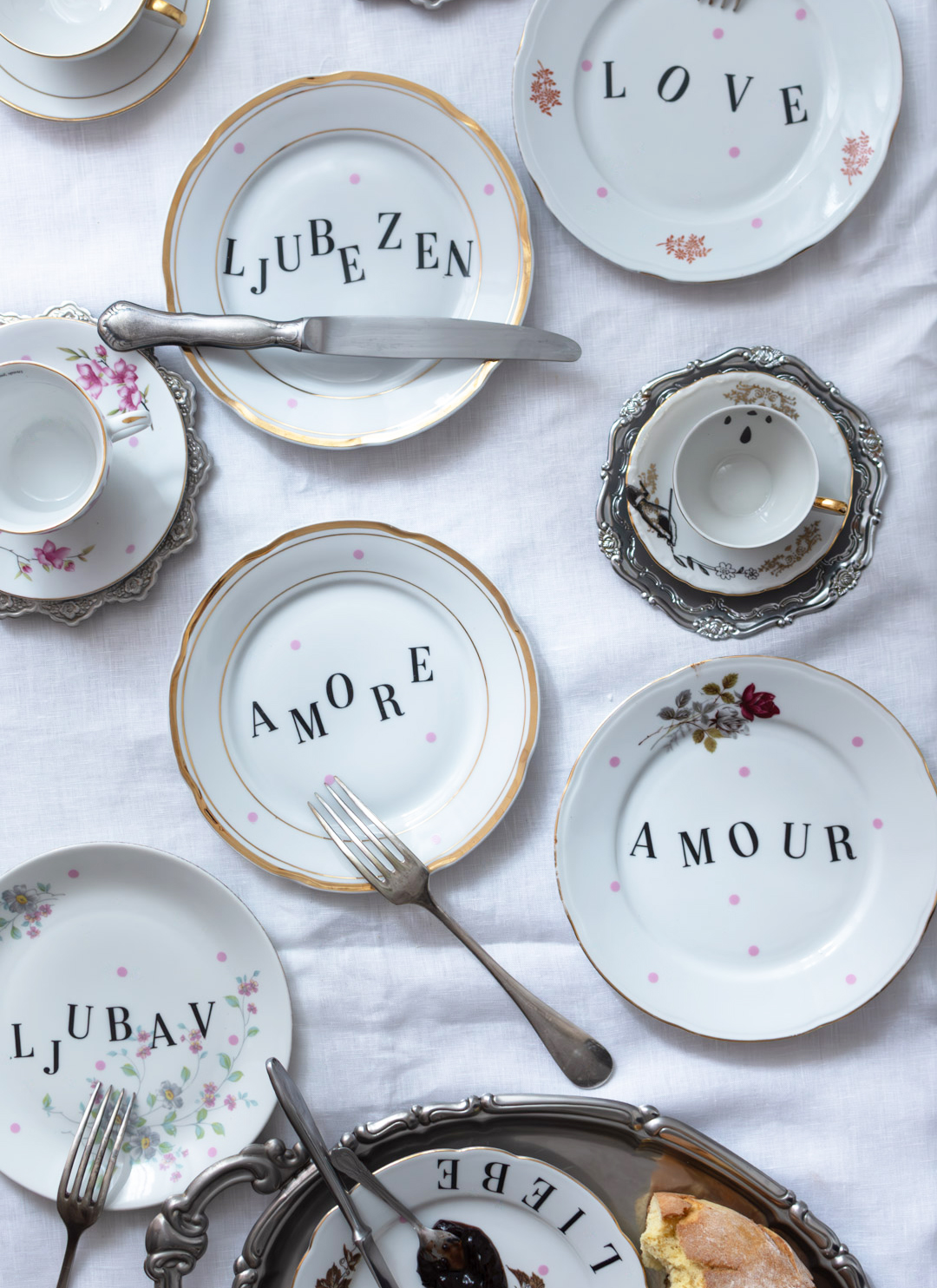 Tražite luksuzni unikatni poklon? Remake ima za vas pravo rešenje. Servis za 6 osoba, koji je sastavljen od 6 dezertnih tanjira.Svaki je drugačiji, unikatan komad vintage porcelana.Ljubav je napisana na 6 različitih jezika. Radjen po principu zero waist -reused vintage porcelana.
