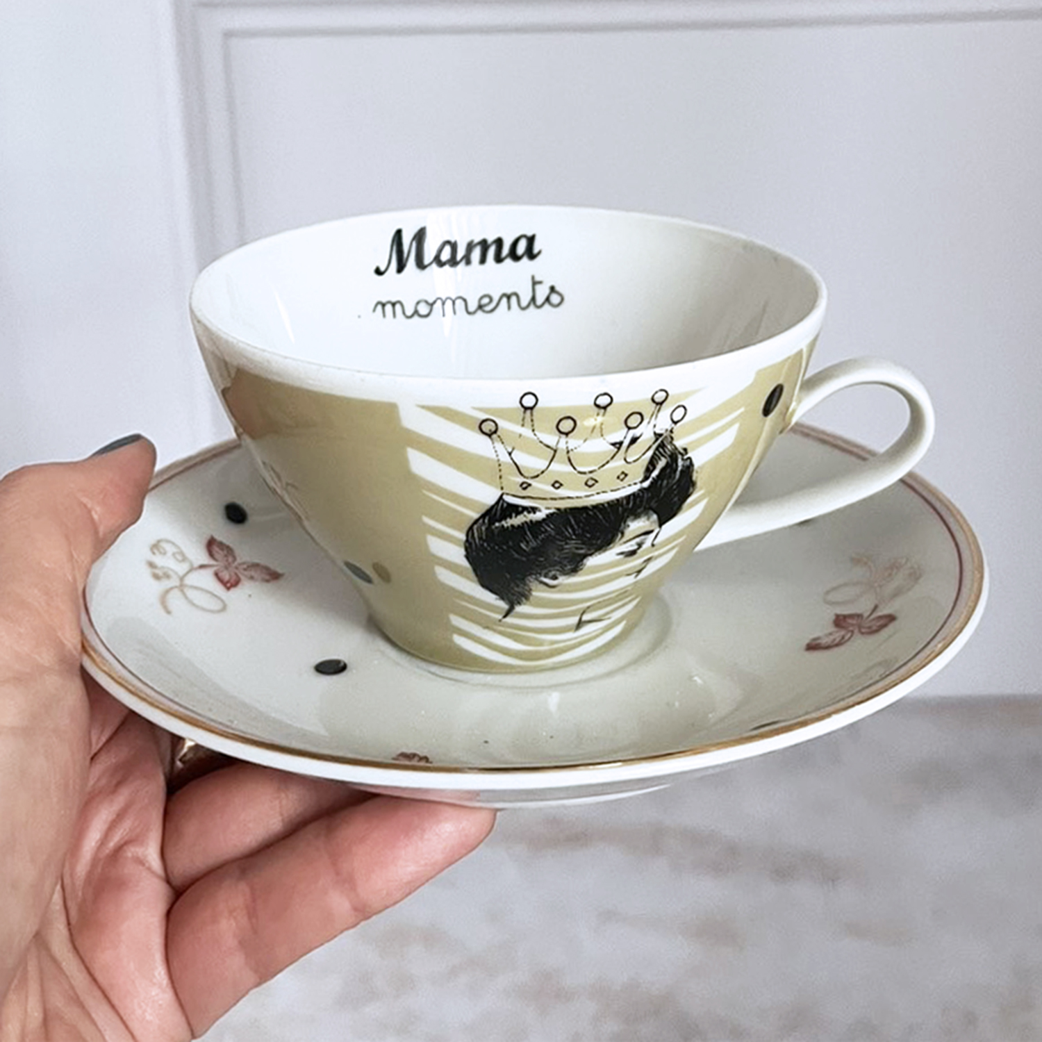 Ova elegantna šoljica od najfinijeg vintage porcelana spaja nežnost roze tufnama i odlučnost crnog ispisa. Savršena za one koji vole kratku, jaku kafu i jasne stavove.